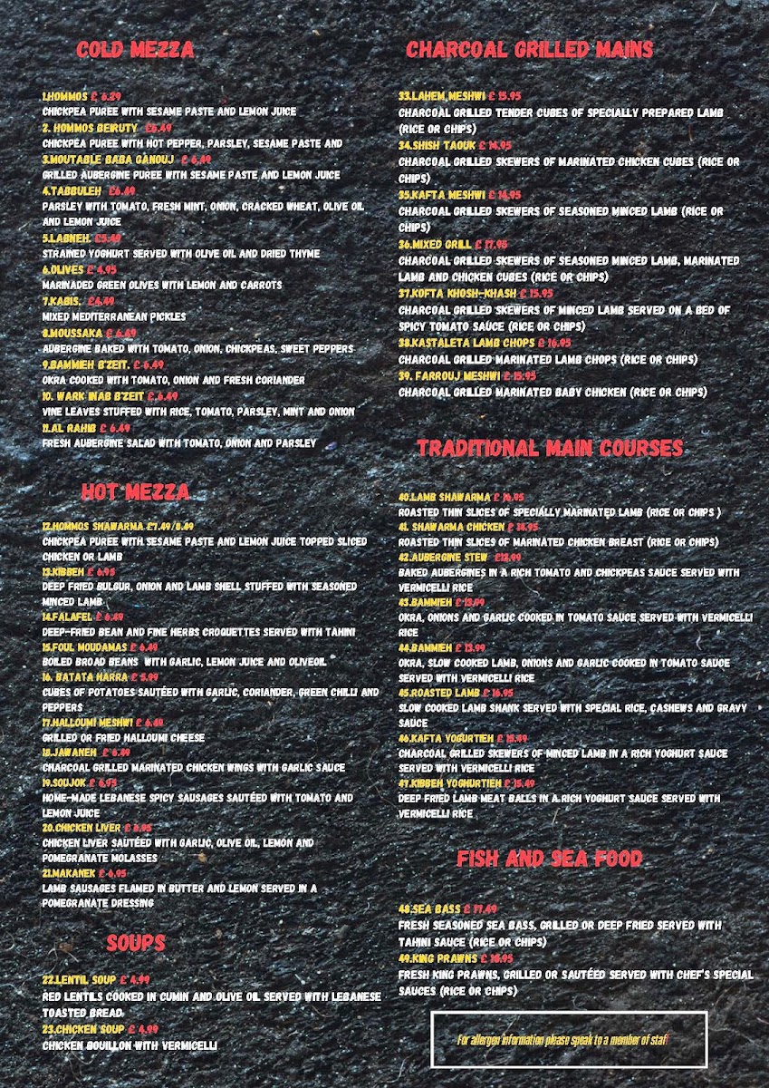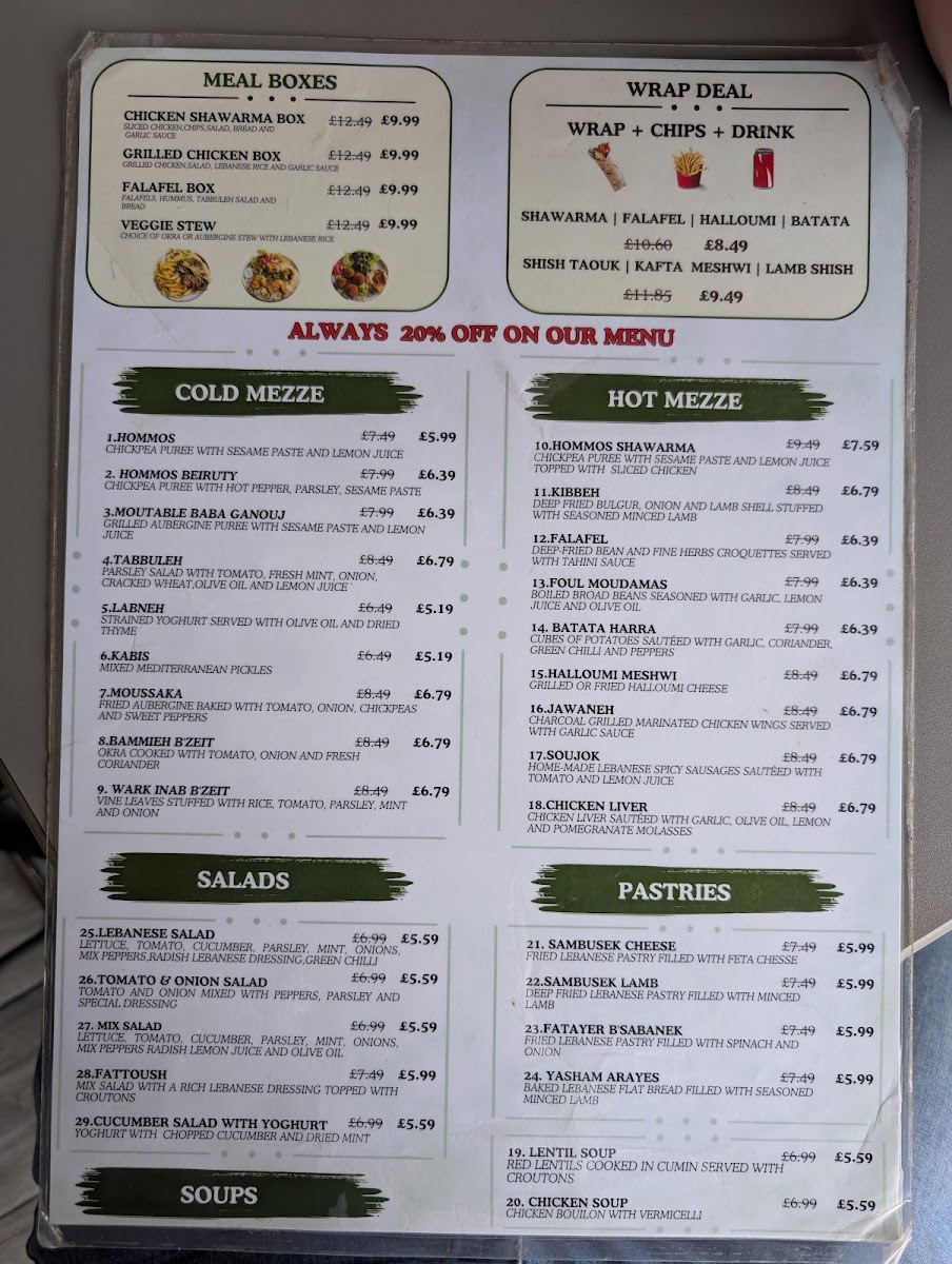 Overall, the menu offers several choices for quick takeout meals that combine grilled meats, fresh salads, traditional appetizers, and seafood, presenting a balanced variety of Middle Eastern flavors.
