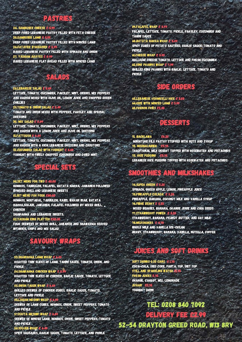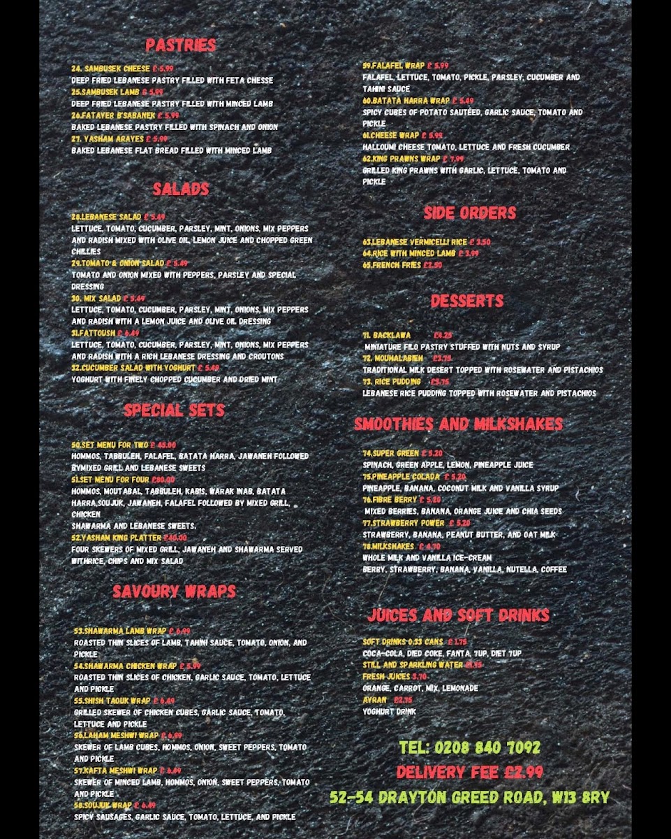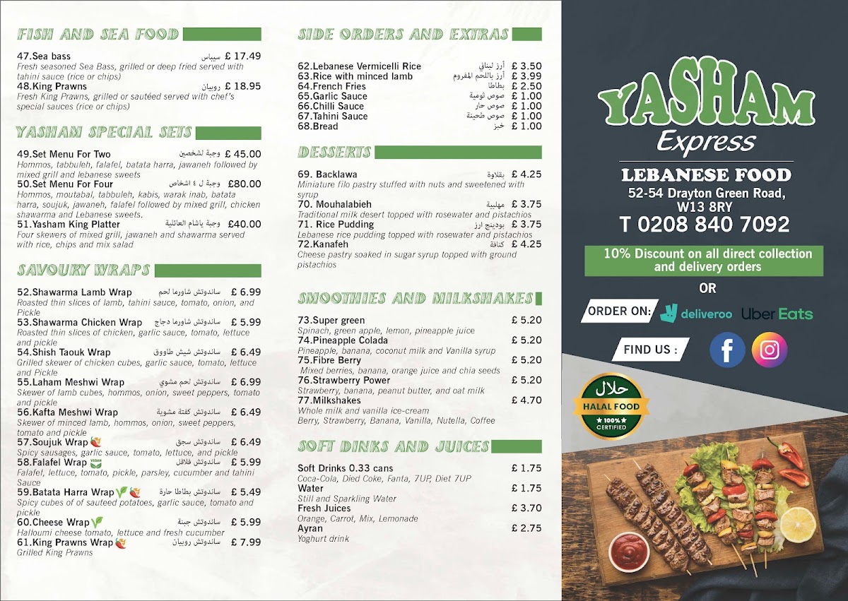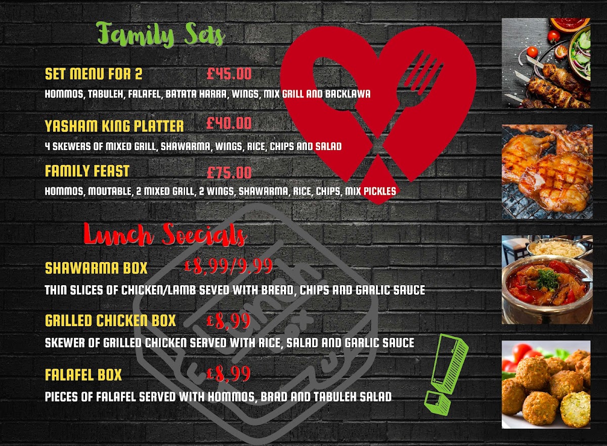 The menu at Yasham Express offers a variety of Middle Eastern and Mediterranean takeout options, structured across several key categories to accommodate different tastes and meal preferences. It is well suited for lunch, dinner, or anytime a quick, flavorful meal is desired.
